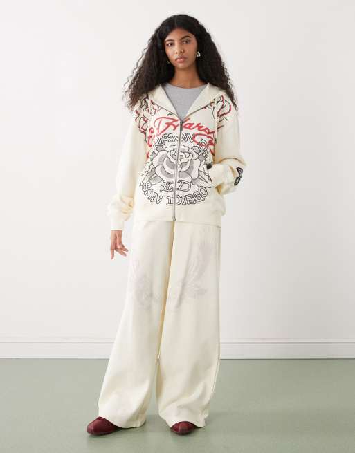 Ed Hardy graphic zip through tracksuit in ecru