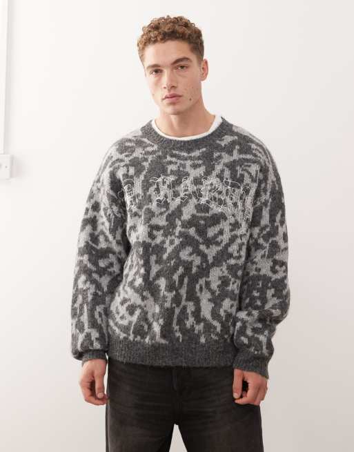 Ed Hardy intarsia leopard knitted crew jumper in grey