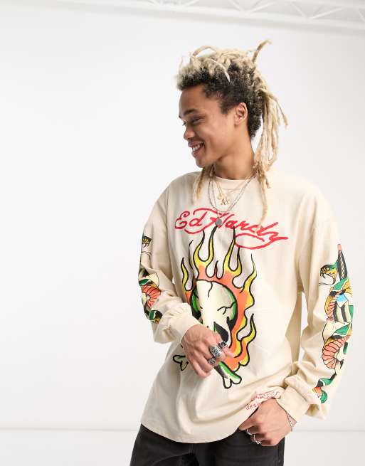 Ed Hardy long sleeve t-shirt with skull graphic in ecru