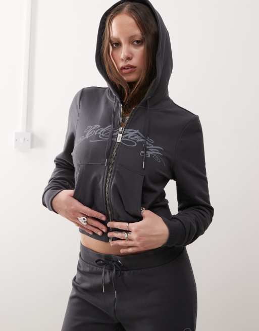 Ed Hardy love is mystery cropped hoodie in charcoal co-ord