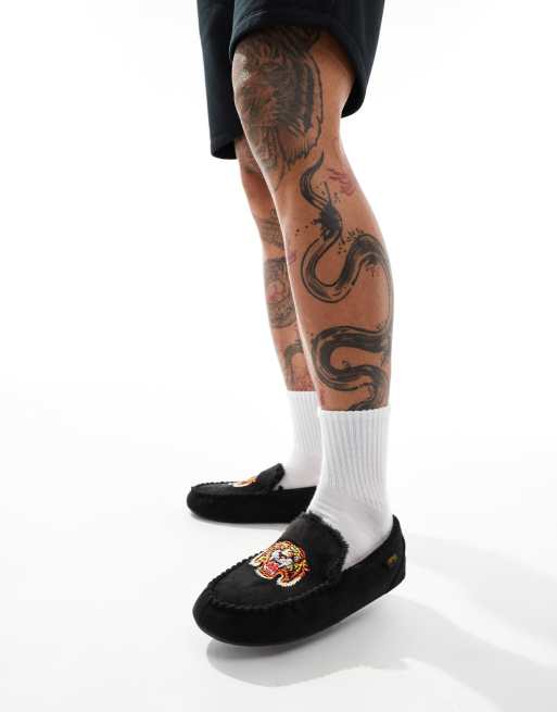Ed Hardy moccasin slippers with embroidered tiger face in black