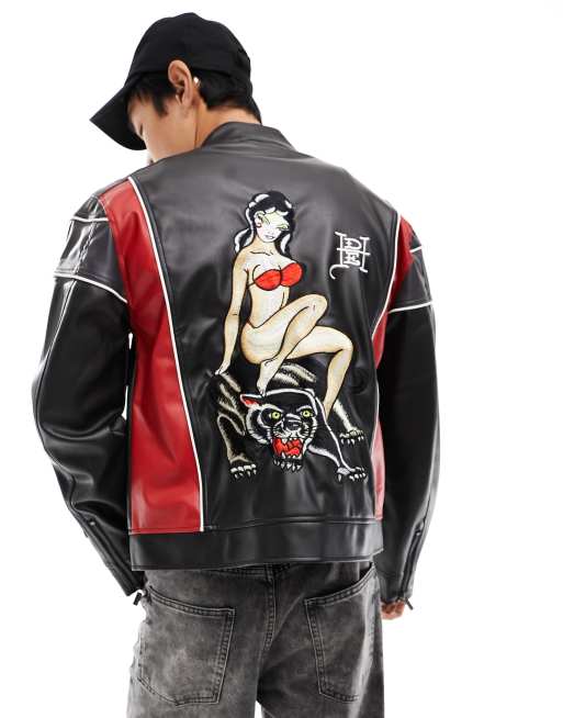 Ed Hardy oversized faux leather moto jacket with lady back print
