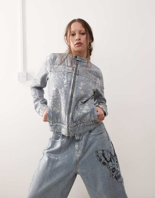 Ed Hardy rose skull motocross denim jacket in bleach co-ord