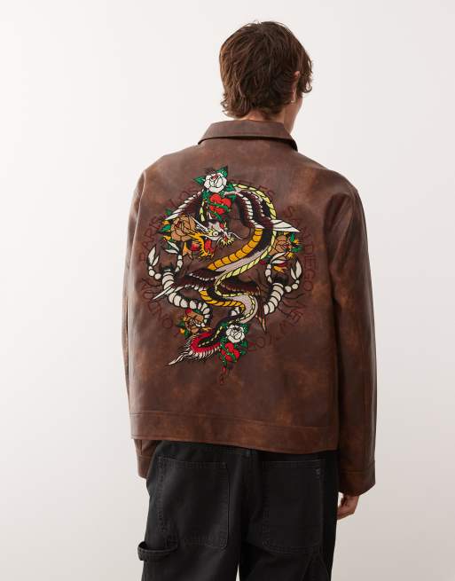 Ed Hardy soaring snake circle zip throguh vegan leather jacket in brown