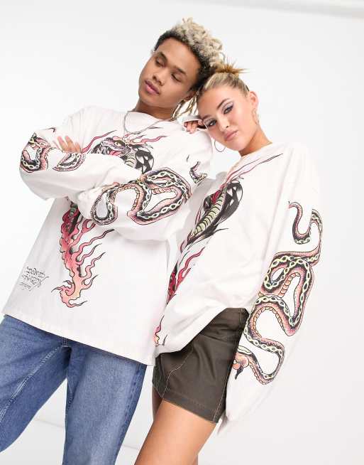 Ed Hardy Unisex long sleeve t-shirt with graphic in ecru