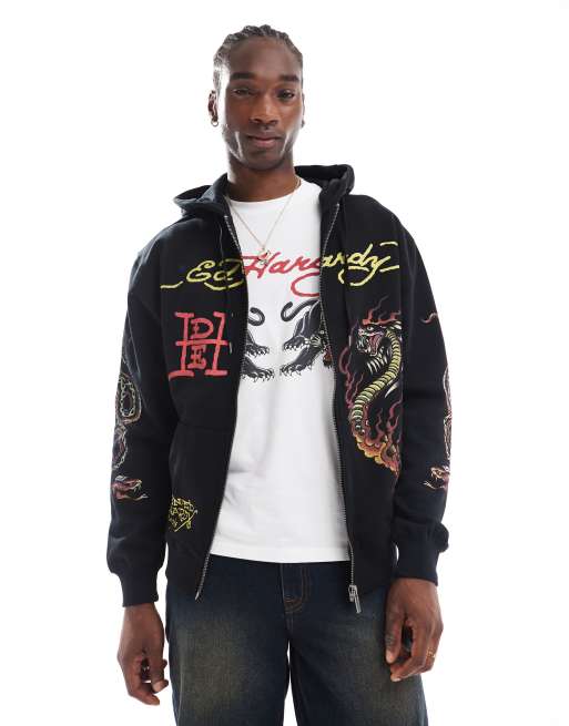 Ed Hardy venom zip thorugh relaxed hoodie in black