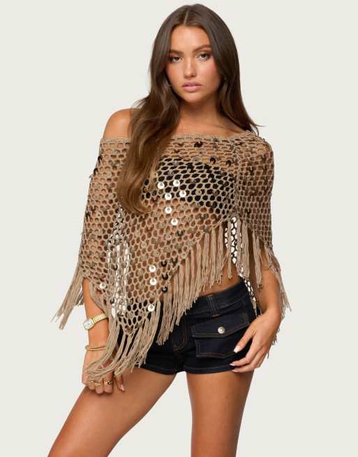 Edikted Fringe sequin crochet poncho in tan