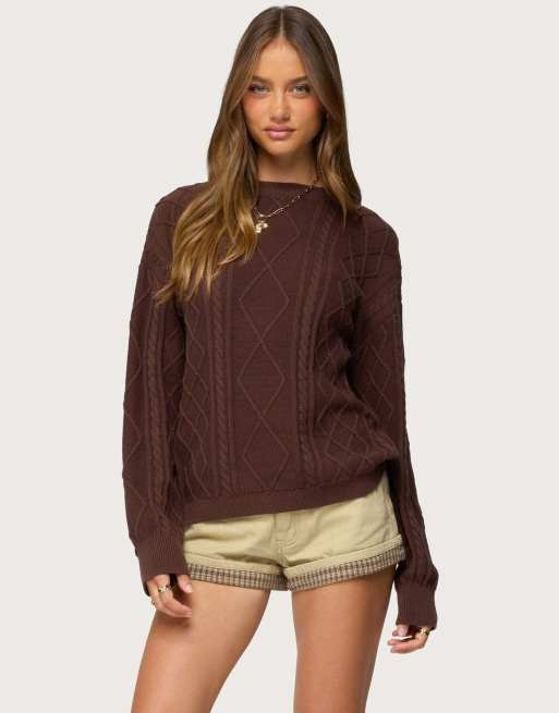 Edikted Jessy cable knit oversized sweater in brown