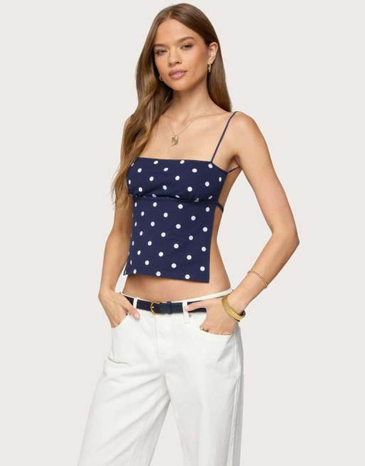 Edikted Jinx polka dot open-back top in navy and white