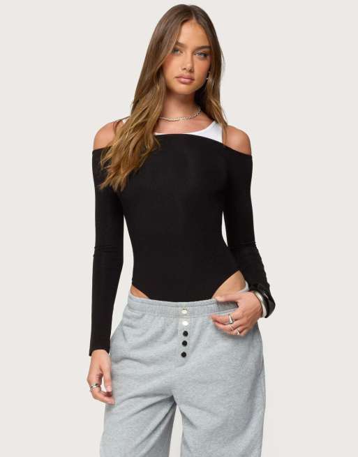 Edikted Layered ribbed off shoulder bodysuit in black