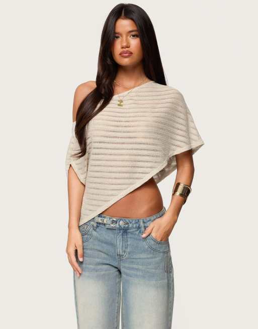 Edikted Loma asymmetric off shoulder knit poncho in beige