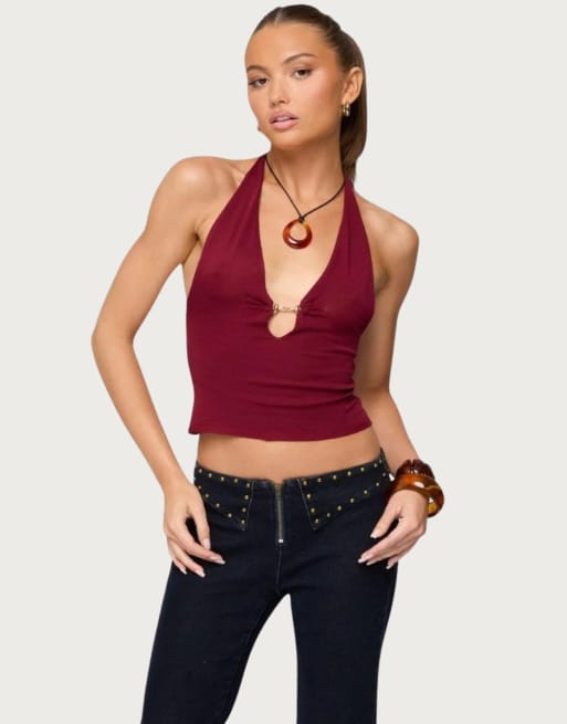 Edikted Missie knitted plunge neck halter top in burgundy