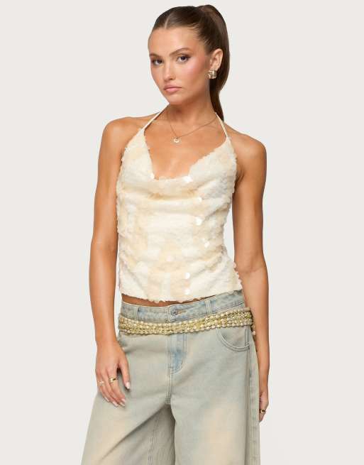 Edikted Reid backless sequin cowl neck top in cream