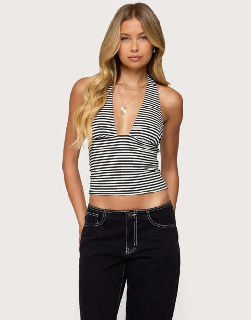 Edikted Sage striped halter top in black and white