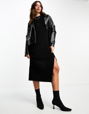 Edited long sleeve knitted midaxi dress with split in black
