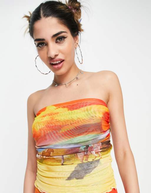 Elsie & Fred ruched mesh lettuce hem bandeau crop top in western print co-ord