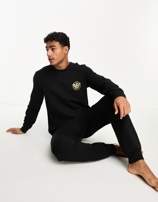 Emporio Armani Bodywear gold logo sweat and jogger lounge set in black