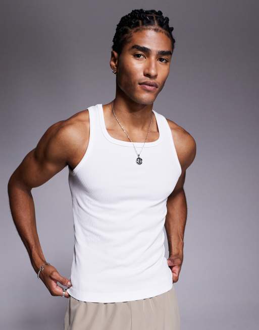 Camiseta deportiva blanca de tirantes y corte slim sin costuras con cuello cuadrado de canalé de 4505