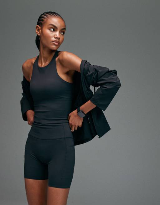 Camiseta negro vacío sin mangas para correr con sujeción interna, costuras reforzadas y bolsillo para teléfono con cremallera premium de 4505