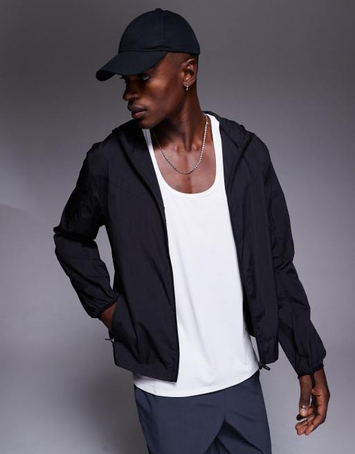 Chaqueta negra ligera resistente al agua de corte cuadrado con capucha de nailon efecto rugoso de 4505