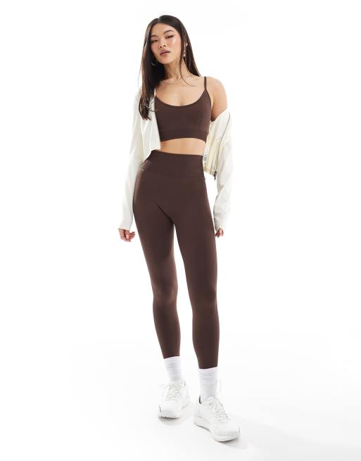 Leggings deportivos marrones de talle alto con diseño contorneado de canalé sin costuras de 4505