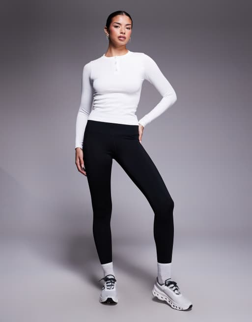 Top interior deportivo blanco de manga larga con cuello panadero de tejido acanalado de secado rápido sin costuras de 4505