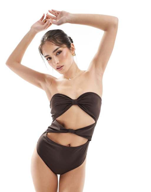 Bañador marrón con escote palabra de honor, aberturas y detalles anudados en la parte delantera de 4th & Reckless