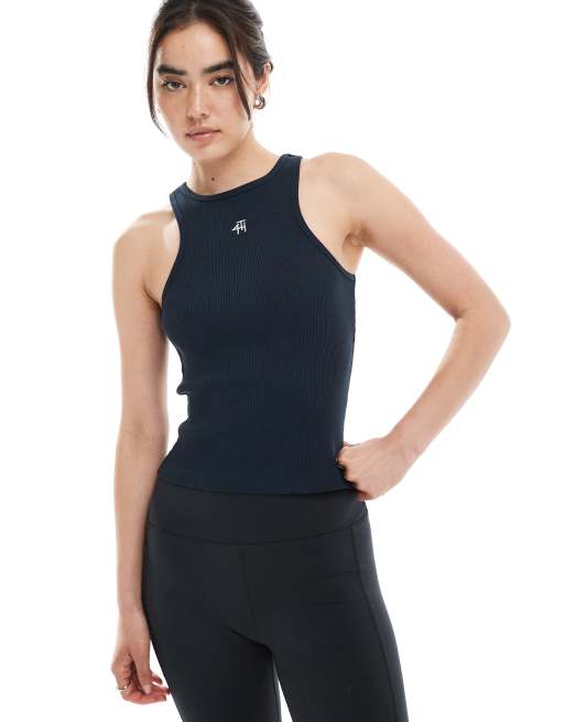 Top azul marino sin mangas con logo bordado de canalé de 4th & Reckless