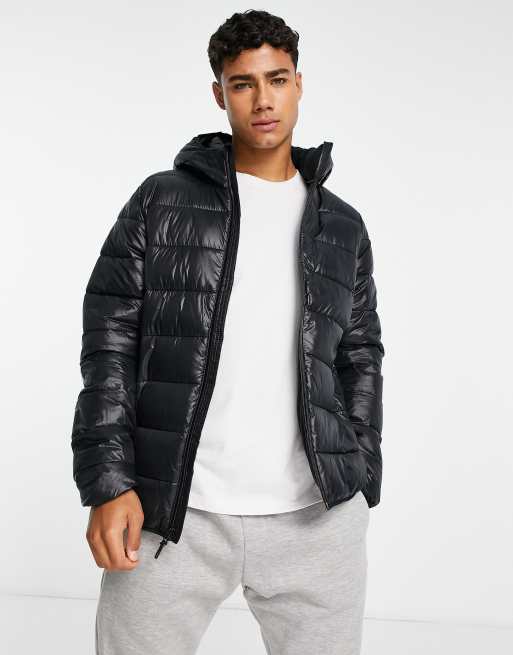 Chaqueta de plumas negra ligera con capucha y acabado ultrabrillante de Abercrombie & Fitch