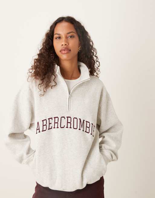 Sudadera gris con cremallera corta y logo delantero de felpa de Abercrombie & Fitch