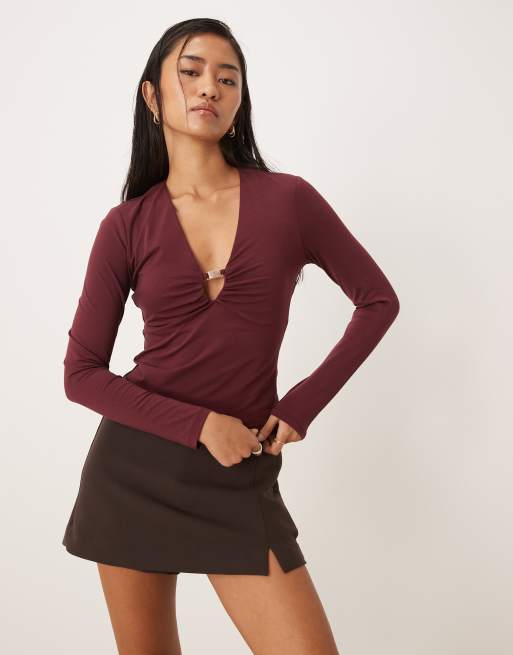 Top morado ciruela de manga larga con cuello de pico, relleno y herraje de Abercrombie & Fitch