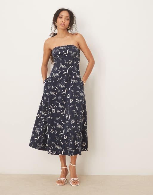 Vestido midi azul sin tirantes de corte acampanado con estampado floral de Abercrombie & Fitch