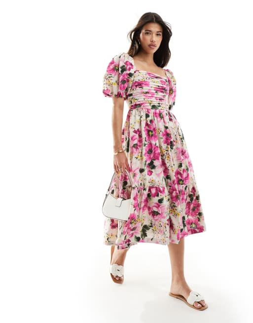 Vestido midi rosa con estampado floral y mangas abullonadas de mezcla de lino Emerson de Abercrombie & Fitch