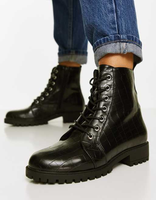 Botines negros planos con cordones y acabado efecto cocodrilo de Accessorize