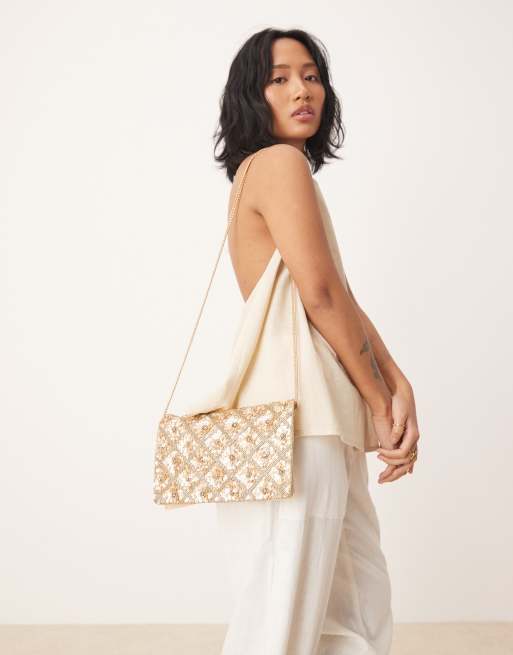 Clutch dorado con solapa y diseño floral con abalorios Tianna de Accessorize