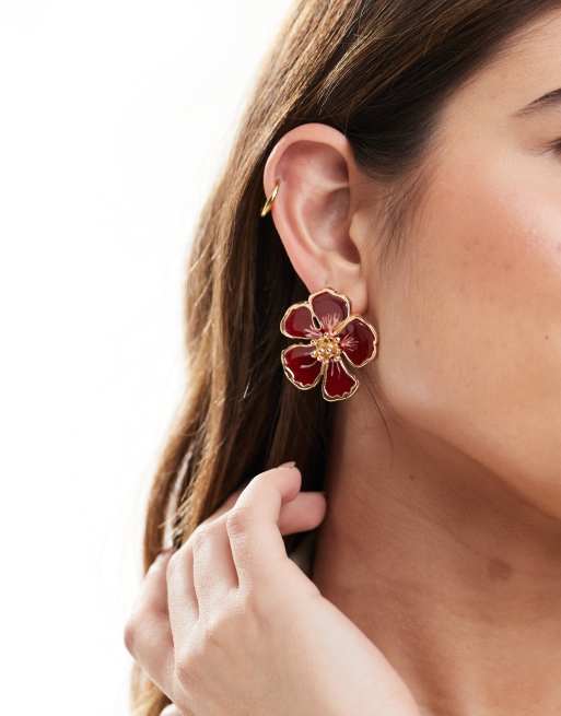 Pendientes de botón burdeos con diseño de flor esmaltada de Accessorize