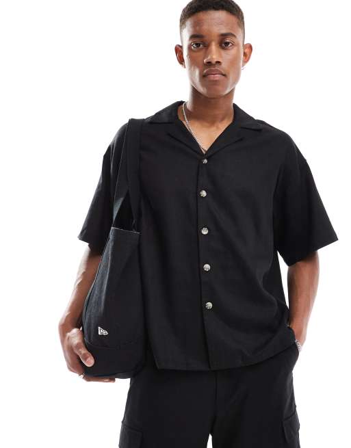Camisa negra extragrande con cuello de solapas de mezcla de lino de ADPT