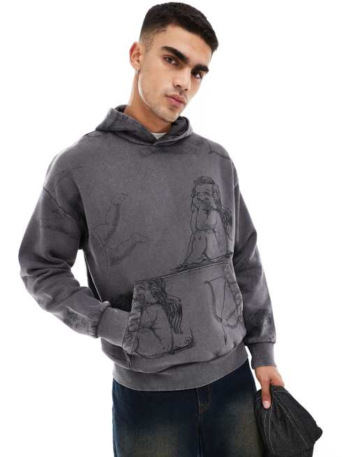 Sudadera gris extragrande con capucha, lavado ácido y estampado integral de ángel de ADPT