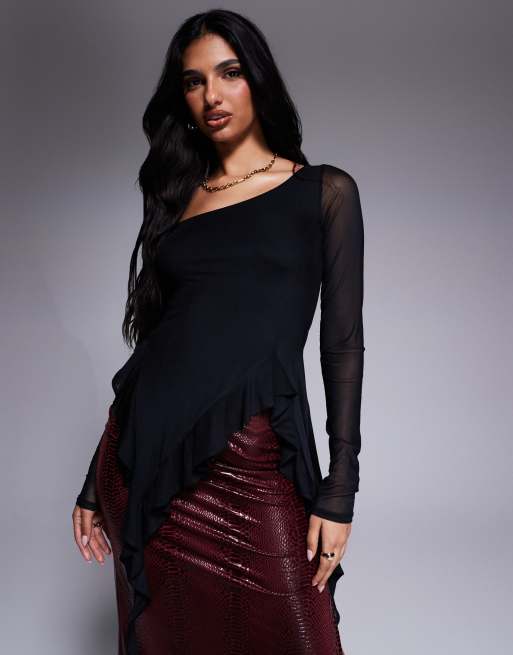 Top negro asimétrico de manga larga de malla Doris de AFRM