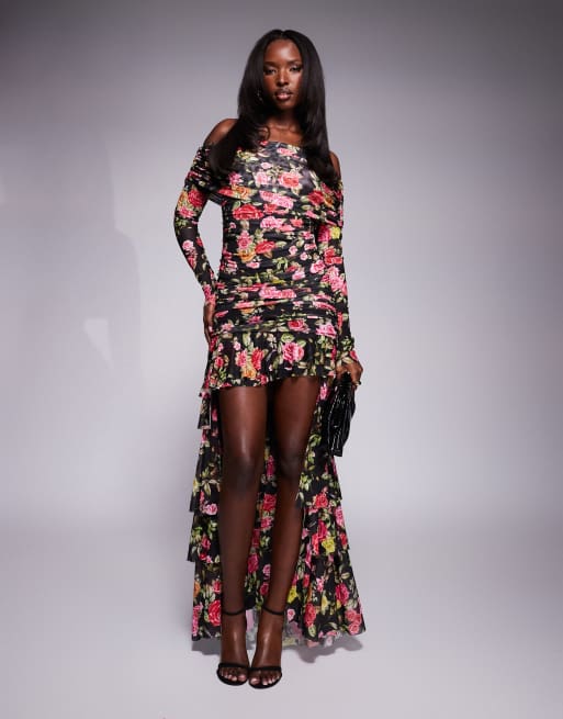 Vestido largo con estampado de rosas, escote Bardot y detalle de cola Kellie de AFRM