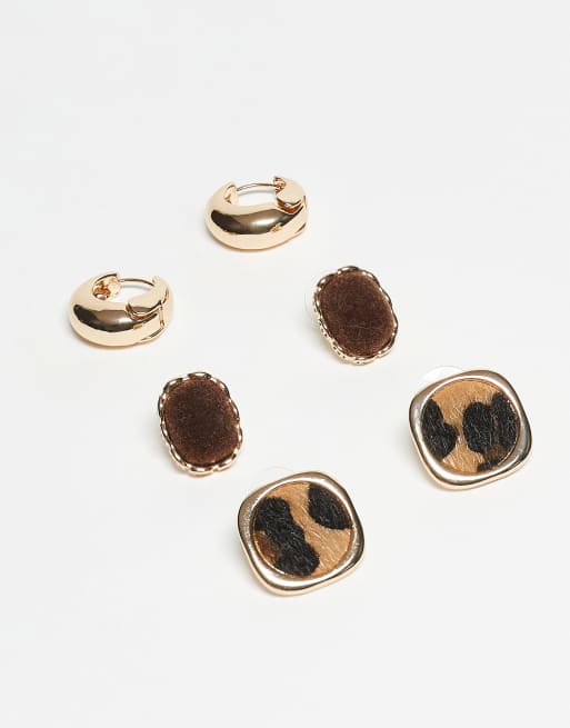 Pack de 3 pares de pendientes de aro y botón marrones con estampado de leopardo Wildchic de ALDO