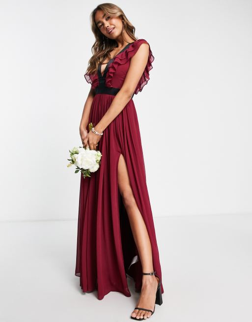 Vestido de dama de honor largo rojo ciruela con abertura hasta el muslo de Anaya With Love