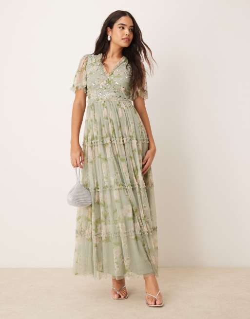 Vestido largo verde salvia con motivos florales de lentejuelas de Anaya