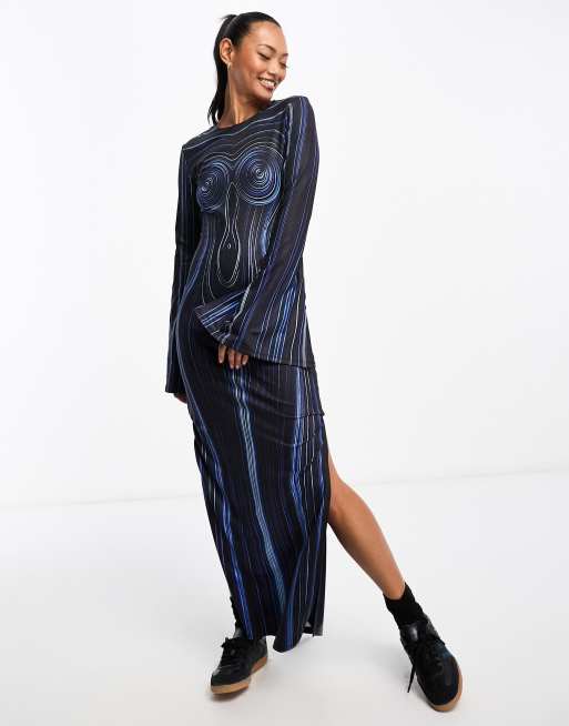 Vestido largo azul con estampado de cuerpo efecto ilusión óptica y aberturas hasta el muslo de Annorlunda