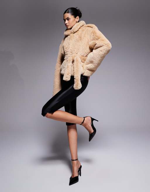 Chaqueta color camel con cinturón y cuello alzado de piel sintética de Aria Cove