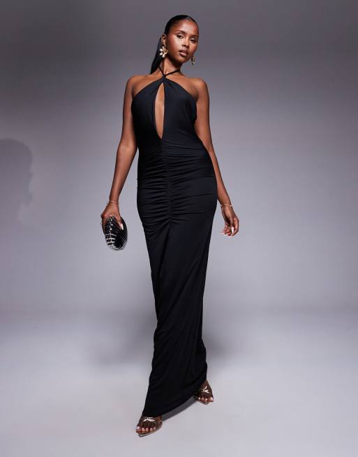 Vestido largo negro fruncido con cuello halter y abertura delantera de Aria Cove