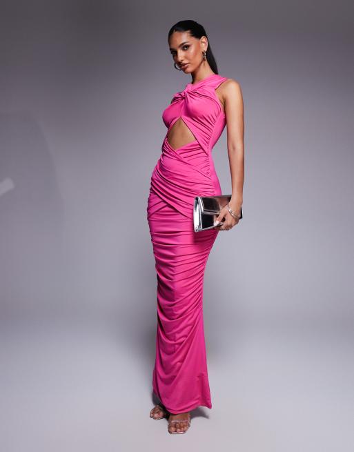 Vestido largo rosa ajustado y ceñido sin mangas con cuello subido, diseño de doble capa y abertura de Aria Cove
