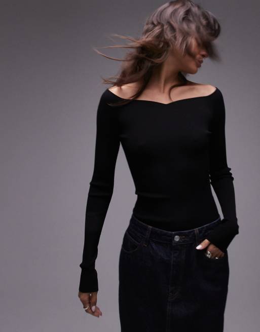 Top negro ceñido con escote Bardot en forma de corazón de punto compacto de ARKET