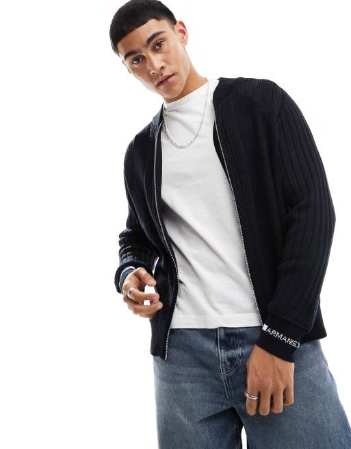 Cárdigan azul marino con cremallera y logo en los puños de punto de lana de merino de Armani Exchange