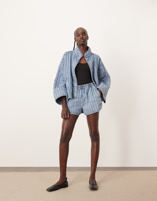 Pantalones cortos azul lavado guateados de estilo casual con bolsillos y acabado efecto desgastado de ARRANGE (parte de un conjunto)